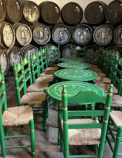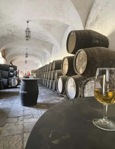 Salón Príncipe Don Álvaro (planta baja): antigua bodega rodeada de botas de manzanilla, con unos 200 m², ideal para almuerzos, presentaciones corporativas o reuniones de empresa.